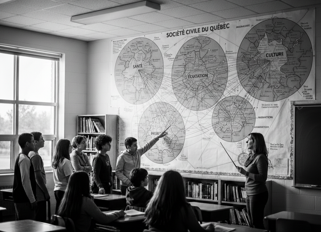 Depuis quelque semaines, Marty-Paule leur présentait plus en détail comment nous nous organisons au Québec pour intervenir sur le terrain, offrir de nombreux services de proximité à la population, se concerter et défendre nos droits. L’enseignante s’appuie pour cette matière sur l’Atlas de la société civile, version papier et web, adapté pour le cours d’univers social du secondaire et validé par un comité scientifique interdisciplinaire. Elle était d’ailleurs très heureuse que son centre de services scolaire leur ait fourni la dernière version de la grande carte de la société civile qui arbore le mur de sa classe. La précédente carte datait de quelques années et il manquait plusieurs nouveaux acteurs importants — des mouvements sociaux, notamment.