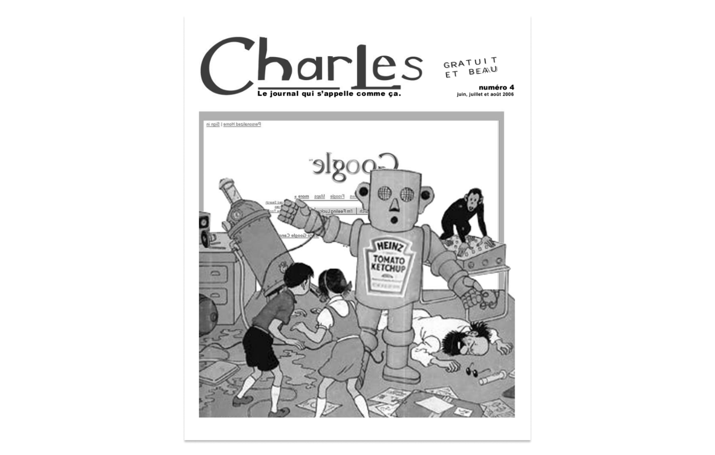 Nous n’avons réalisé que 4 numéros de Charles en tout et pour tout en 2005 et 2006. Nous avions quelques abonnés, mais la plupart des numéros étaient distribués gratuitement dans des cafés et bars à Montréal et sur la Rive-Sud.