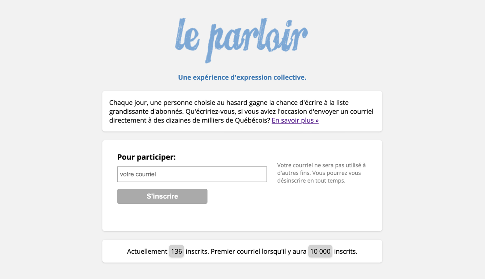 Le Parloir est une liste grandissante de courriels constituée autour d'un fonctionnement simple: chaque jour, une personne choisie au hasard aura la chance d'écrire un courriel qui sera acheminé à tous les autres.